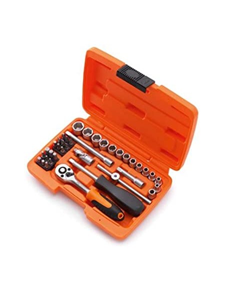 - 38-piece, 1/4" toolbox in orange with high-quality, chrome-vanadium tools.